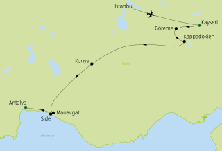 Tag 6 Kappadokien – Konya – Antalya • Bahnen Sie sich Ihren Weg durch die facettenreiche Landschaft Anatoliens. Schließlich erreichen Sie in Konya die Grabmoschee von Mevlana, dem Gründer des Mevlana-Ordens. Sie ist der zentrale Punkt des Mevlana Museums. Während einer Besichtigung erfahren Sie alles über die Geschichte der Grabmoschee und warum sie heute ein beliebter Wallfahrtsort für fromme Muslime ist. Fragen Sie doch, was es mit den „tanzenden Derwischen“ auf sich hat. Weiter geht es über das eindrucksvolle Taurus Gebirge bis zur Türkischen Riviera. Sanft spiegelt sich die Sonne im türkisblauen Wasser und heißt Sie herzlich willkommen! Abendessen und Übernachtung im Raum Antalya.